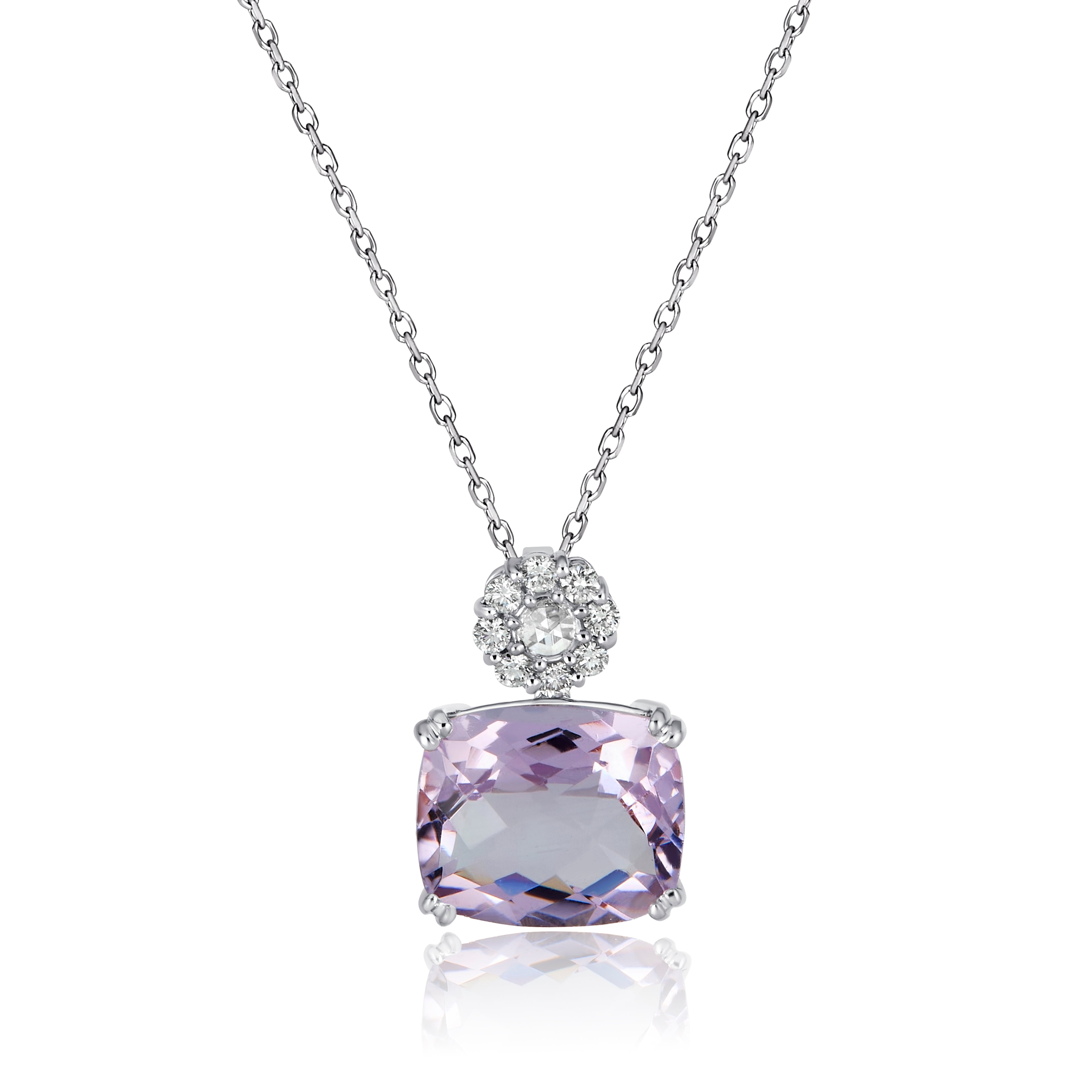 Cushion Amethyst Drop Style Pendant with Natural Diamond Floral Accent on a 16-in Cable Chain