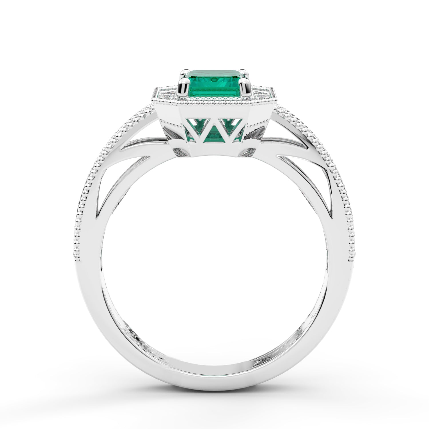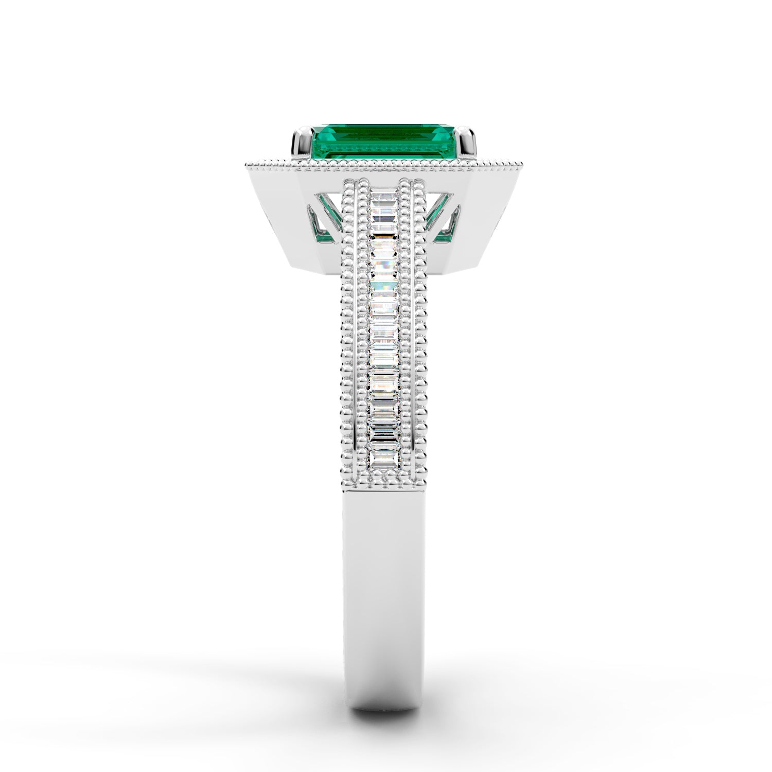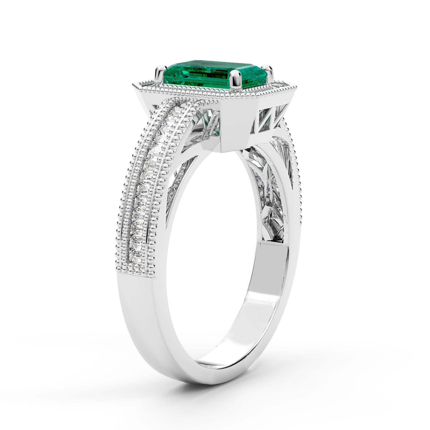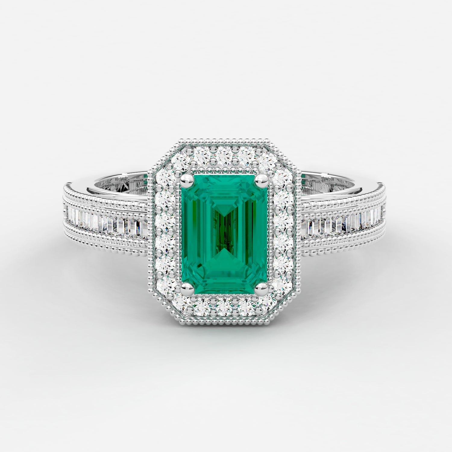 Emerald and Diamond Vintage Style Fashion Ring with Halo and Baguette and Milgrain Accents