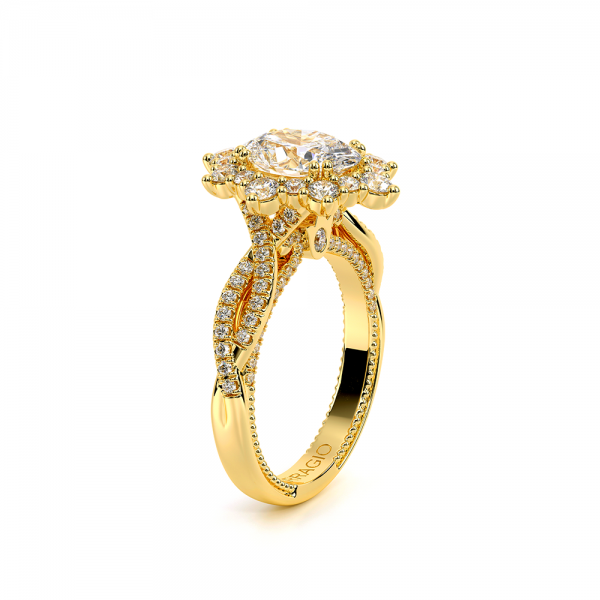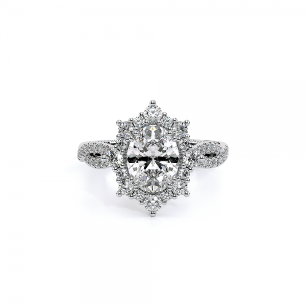 Couture-0481OV Oval engagement ring features Verragio' s handcrafted starburst halo. Meticulously-set round brilliant-cut diamonds sit atop a twisted band while a half-diamond riviera is refined by Verragio' s timeless signature crest and beading.