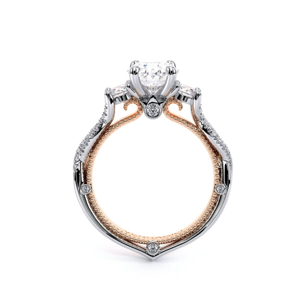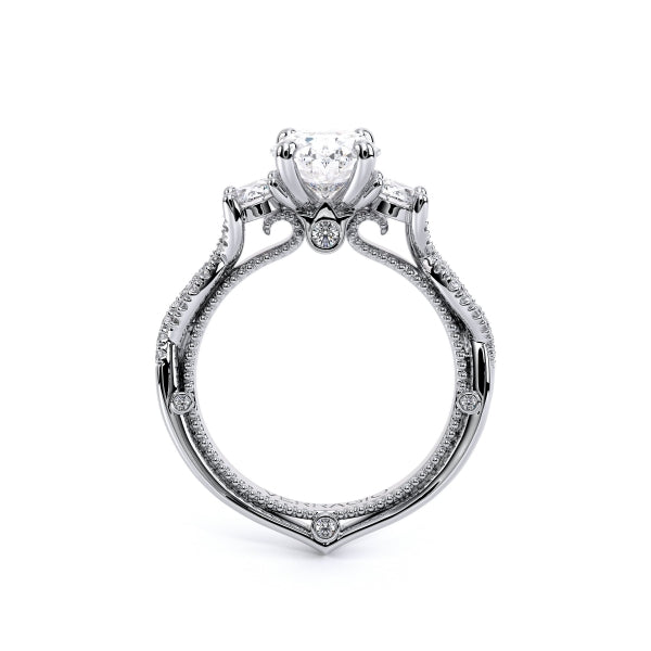 Couture-0423OV Elegant Twist Oval Engagement ring pave with round brilliant diamonds, featuring Princess Side stones, Verragio Crest-Bezel set and upward Scrollwork Signature Beading profile, completed with the Couture pointed shank.