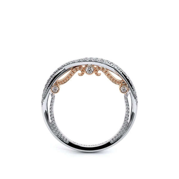 INSIGNIA-7070W diamond wedding ring from the Insignia Collection, featuring round brilliant-cut diamonds pave set on a twisted band. Unique with bezel set diamonds with distinguishing Insignia Scrollwork accompanied by Verragio's timeless signature beading and crest.