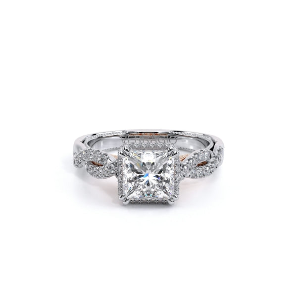 Insignia-7099P princess engagement ring featuring Verragio's handcrafted stardust halo adorned with meticulously set round brilliant-cut diamonds atop a twisted band. Accompanying diamond Insignia scrollwork refined with Verragio's timeless signature crest and beading.
