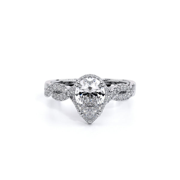 Insignia-7099PS pear engagement ring featuring Verragio's handcrafted stardust halo adorned with meticulously set round brilliant-cut diamonds atop a twisted band. Accompanying diamond Insignia scrollwork refined with Verragio's timeless signature crest and beading.