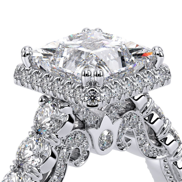Insignia-7100P accentuates your princess engagement ring with a pave set stardust halo illuminated by round brilliant-cut diamonds. featuring, a shared-prong set band and handcrafted Insignia's scrollwork. Refined by Verragio's signature beading and crest.
