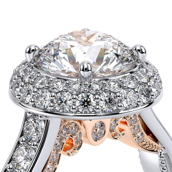 Insignia-7101R round halo engagement ring. featuring, Verragio's uniquely designed handcrafted double pave halo. Adorned with meticulously channel set brilliant-cut diamonds on a straight band along with Insignia's distinctive diamond scrollwork. Refined by Verragio's timeless signature beading to enhance a round diamond center.