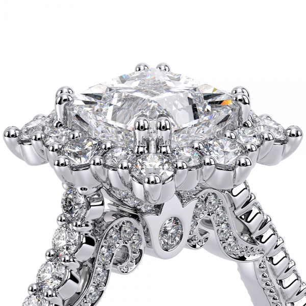 Insignia-7108P princess engagement ring features Verragio' s handcrafted starburst halo. Highlighting, meticulously set round brilliant-cut diamonds atop a diamond straight band. Refined with Verragio' s diamond Insignia scrollwork, our timeless signature crest and beading.