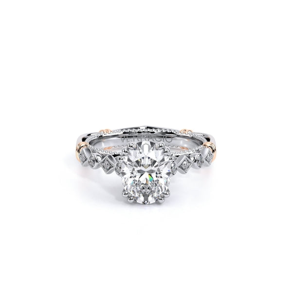PARISIAN-154OV is a vintage inspired engagement ring that focuses on the unique bezel set brilliant-cut diamonds, handcrafted lace and rose gold Timeless wraps that enhances the Oval center.