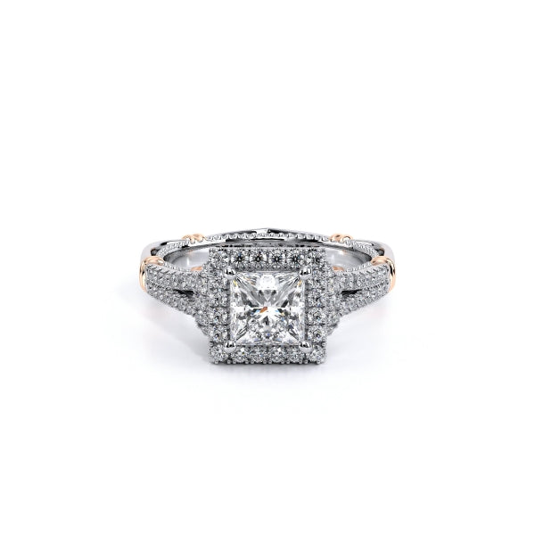 Parisian-117P is a uniquely designed vintage engagement ring that showcases two hand assembled side diamond encrusted pillars that accentuates the pave set princess halo and continues the exceptional detail with the addition of the rose gold Timeless wraps.