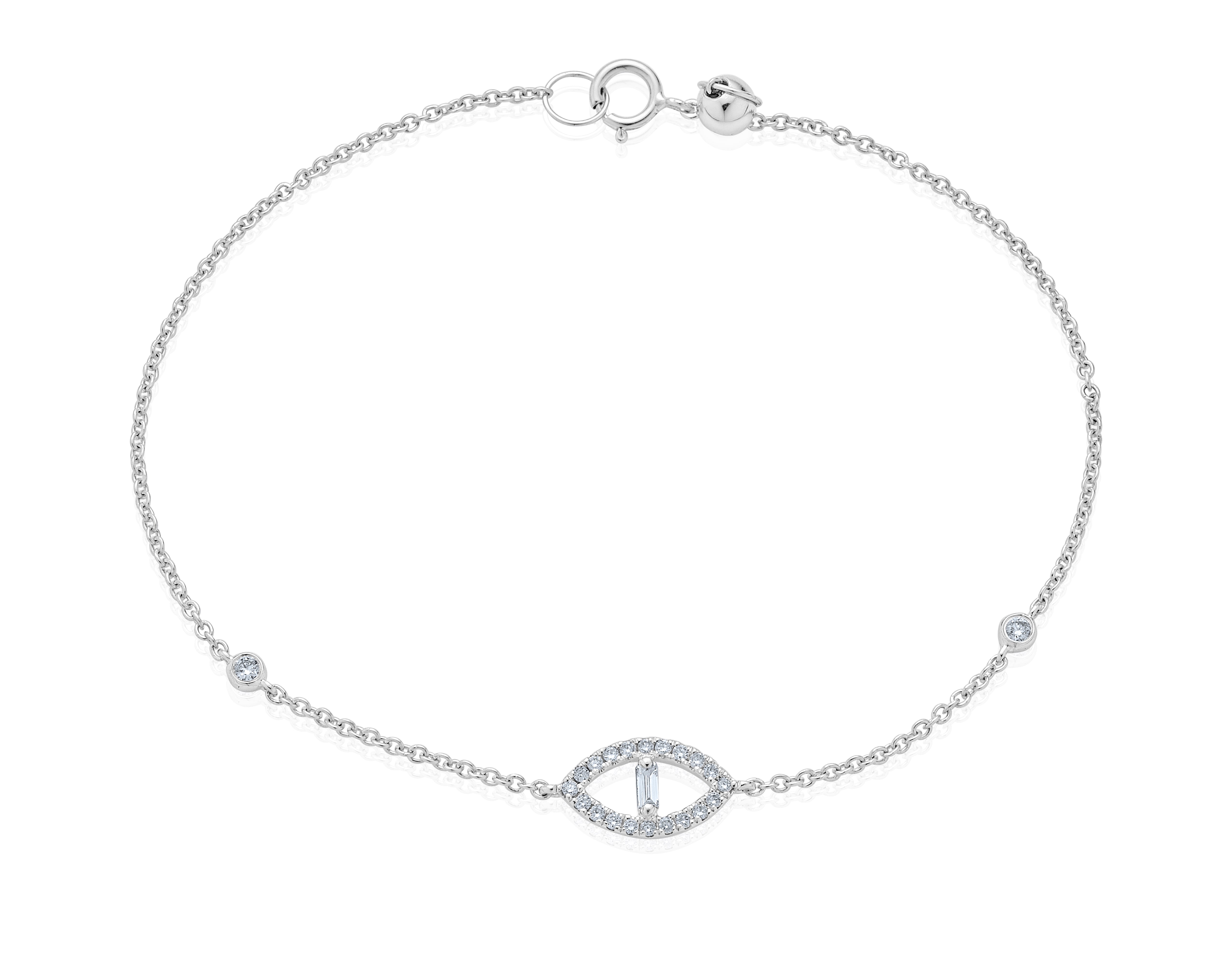 Petite 18 Karat White Gold Evil Eye Bracelet with Baguette Diamond Accent.