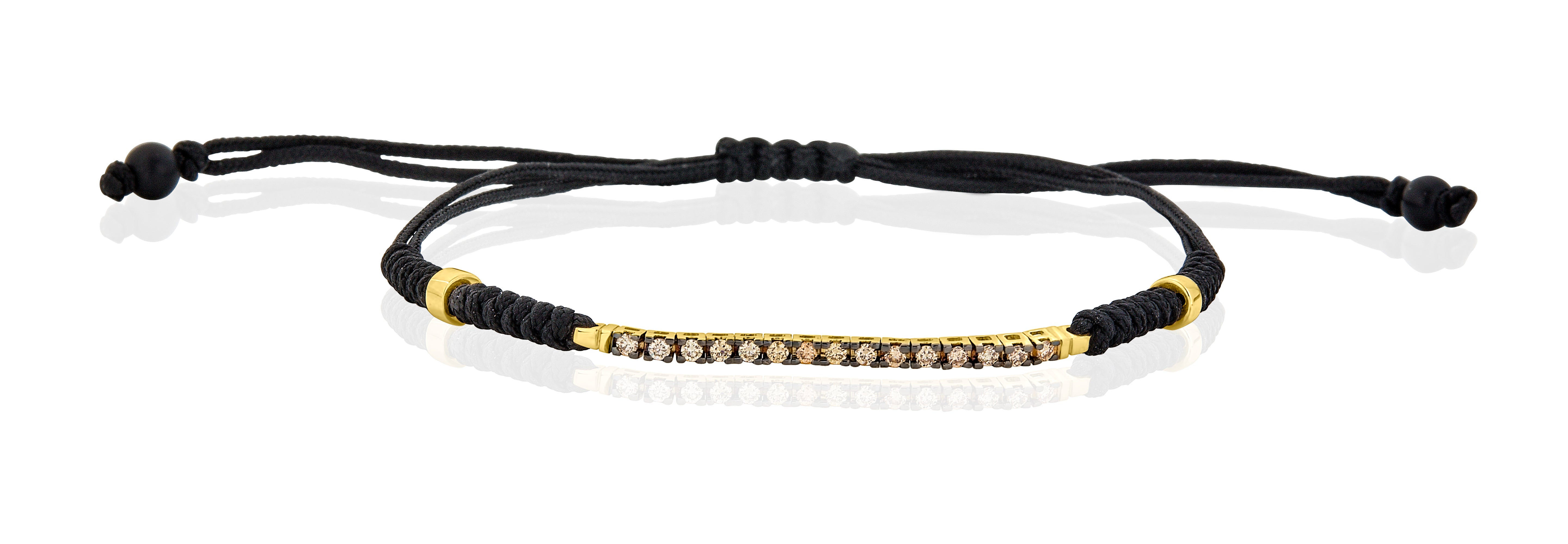 18 Karat Yellow Gold Bar Bracelet with Prong Set Diamonds with Black Onyx on an Adjustable Rope Bracelet.