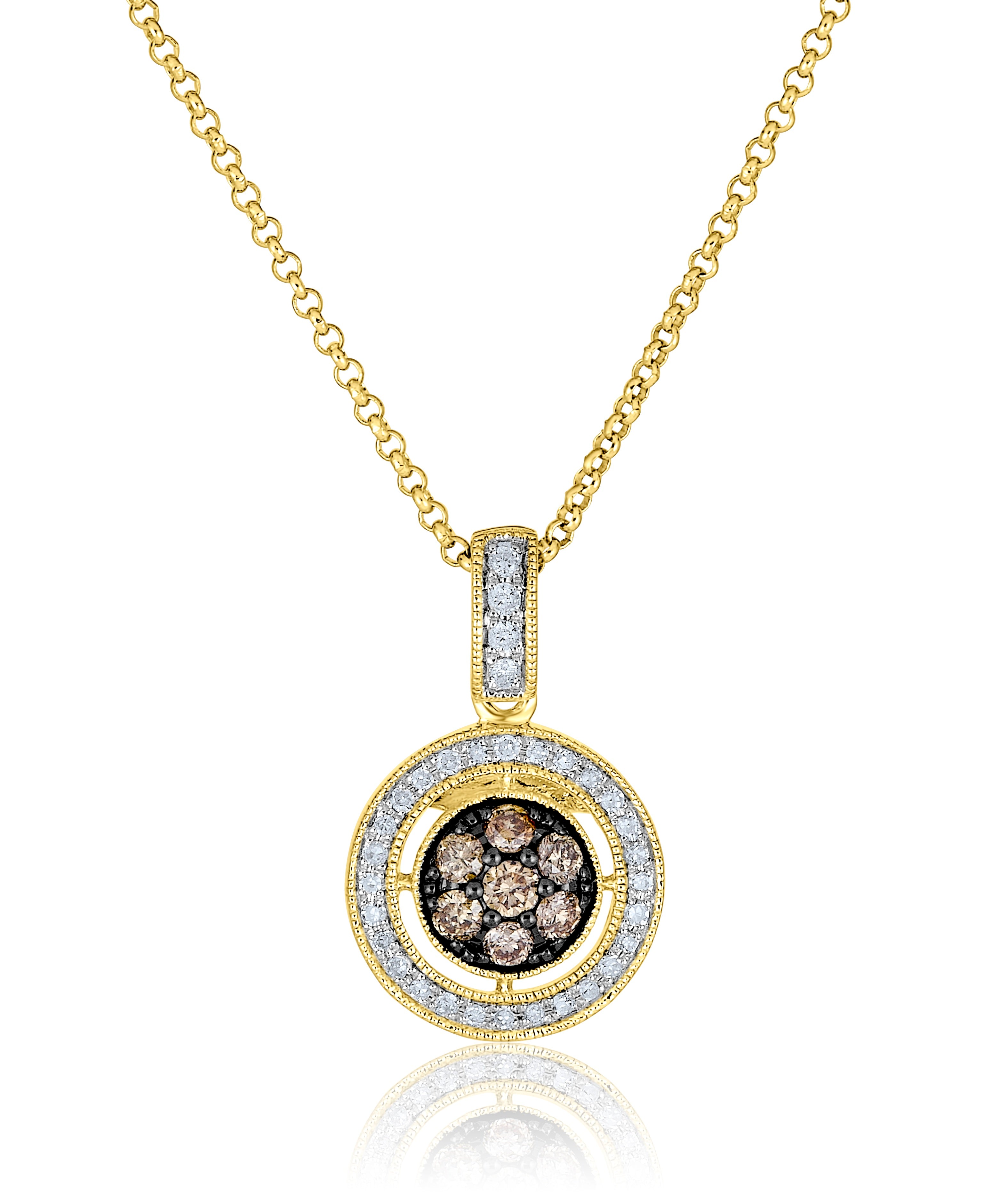 14 Karat Yellow Gold Cluster Style Round Fancy Brown Diamond with Natural White Diamond Halo Pendant Necklace.
